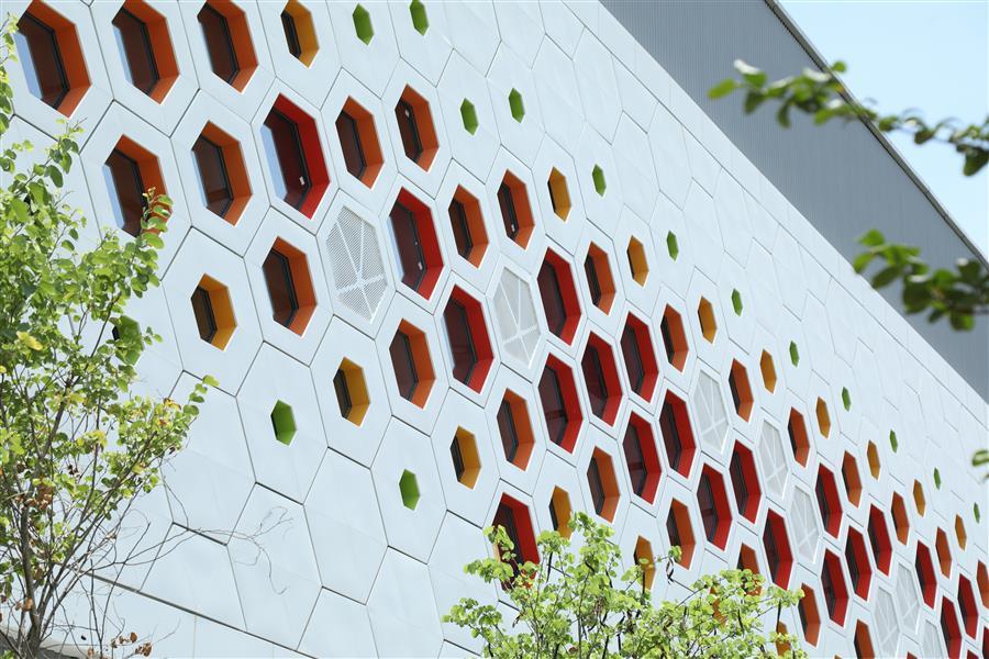 項目建筑外立面設計將柳州本土文化元素“紫荊花”與康恒公司“蜂巢”理念完美融合,多層次的幕墻肌理協同自然光線,在不同照射條件下呈現出多樣的光影效果,不僅呼應了垃圾焚燒發電精細的工藝流程,更體現了人與自然和諧共生的美好愿景。