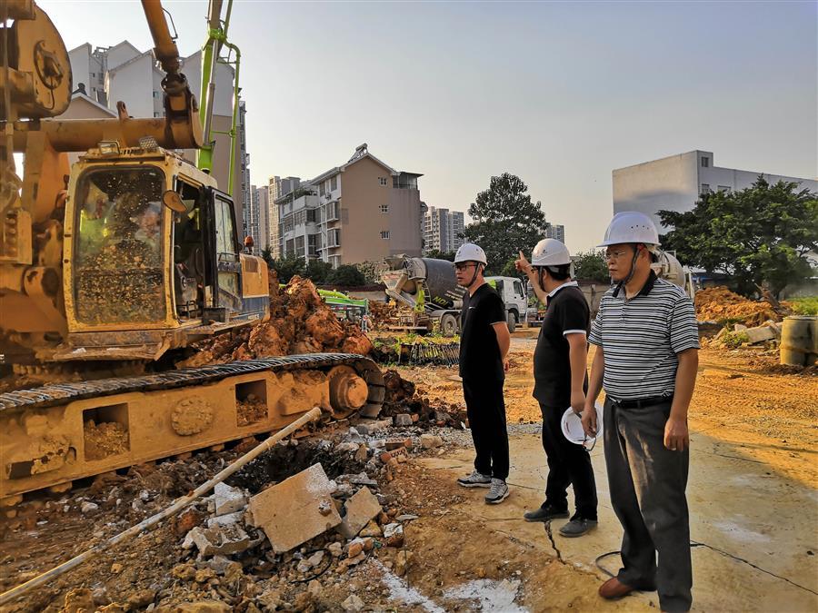 10月5日上午,桂東分公司經(jīng)理謝勇、黨支部書記黃桂軍來到柳州市防汛抗旱物資儲(chǔ)備倉庫工程項(xiàng)目現(xiàn)場慰問看望節(jié)假日仍堅(jiān)守崗位的一線員工。該項(xiàng)目施工現(xiàn)場地質(zhì)條件復(fù)雜,容易塌孔且地下層部分為巖石層結(jié)構(gòu),施工難度大。為確保在甲方要求的工期內(nèi)完成施工,工人們節(jié)假日仍加班加點(diǎn)搶工期。他們腳踏黃土,頭頂著炎炎烈日,揮灑著蒸騰的汗水,以實(shí)際行動(dòng)為集團(tuán)公司早日躋身世界500強(qiáng)貢獻(xiàn)力量!