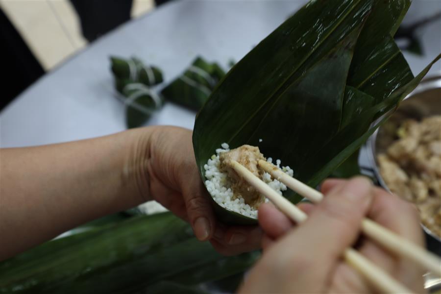 經過簡單的現場教學后,大家領取材料,分組配合,踴躍參與包粽子比賽,只見大家捋粽葉、放餡、封口、扎捆,動作一氣呵成,不一會兒,一只只各式各樣的粽子就在大家手中成型。